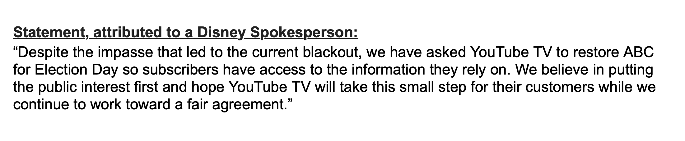 As you know, Disney and YouTubeTV haven’t been able to cut a deal, so ESPN and ABC are not being shown on the YTTV platform currently:
