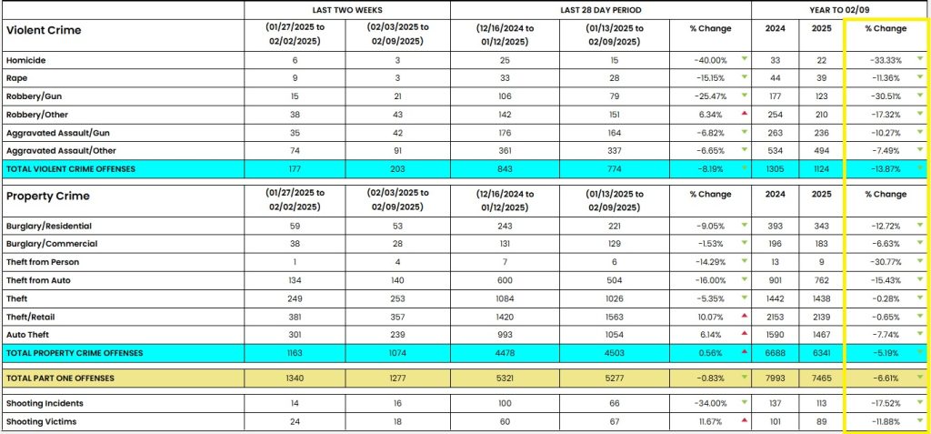 Looking a little further, the Birds played five times in the early portion of the year, going 5-0 between January 5th and February 9th en route to a title. The police data says that between January 1st and Super Bowl 59, that the year-to-date homicide rate was down 33%, while overall violent crime was down 13.87% –