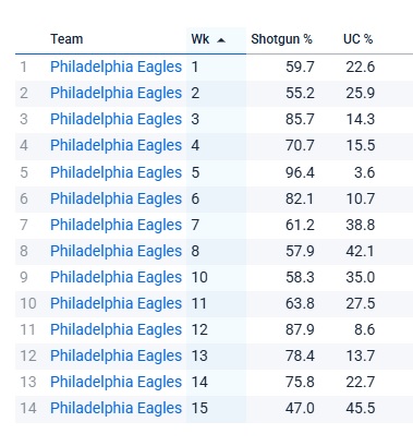 What’s interesting is that the Birds had four-game window in which they upped their under center numbers between weeks 7 and 11. They went 4-0 in that stretch, beating the Vikings, Giants, Packers, and Lions. The caveat, of course, is that they only scored 26 points total against Green Bay and Detroit, but the shotgun numbers increased against Dallas, Chicago, and LA, and they lost all three of those games. Earlier in the season, they were running shotgun at a heavy clip and started 4-0, so go figure.