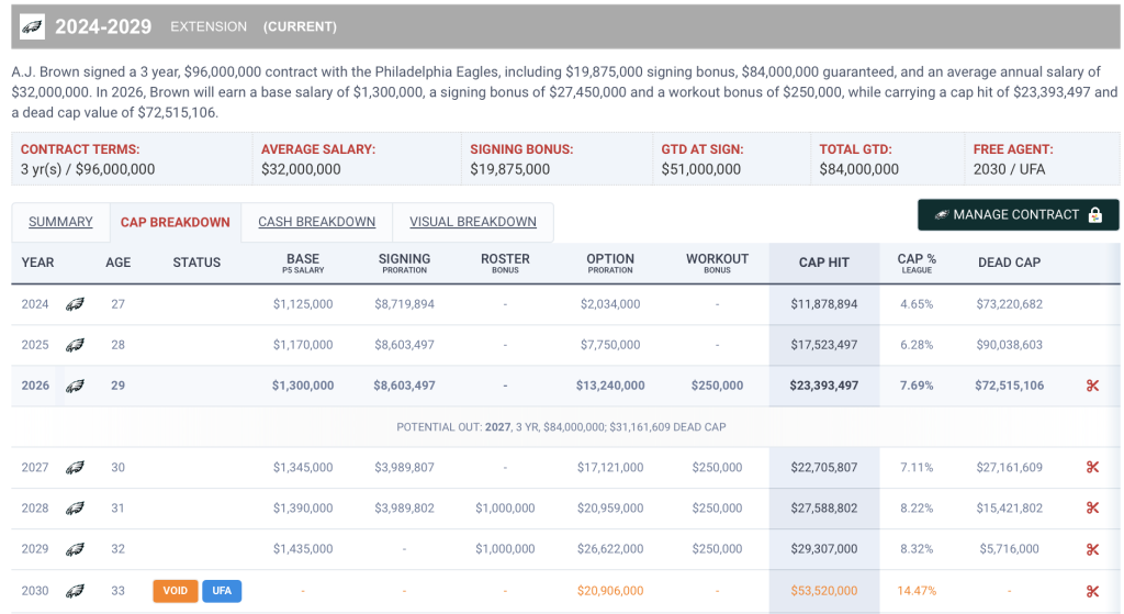 They handed Brown a three-year contract extension on April 24th, 2024, worth $96 million, including $84 million guaranteed. This, at the time, was the most guaranteed money ever handed to a wide receiver as well as the highest average annual value for the position at $32 million. But most concerning in this is a dead cap value of $72.5 million, laid out here by Spotrac: