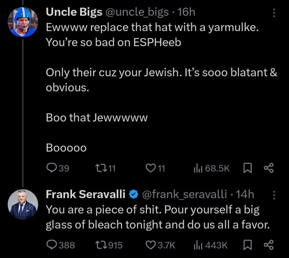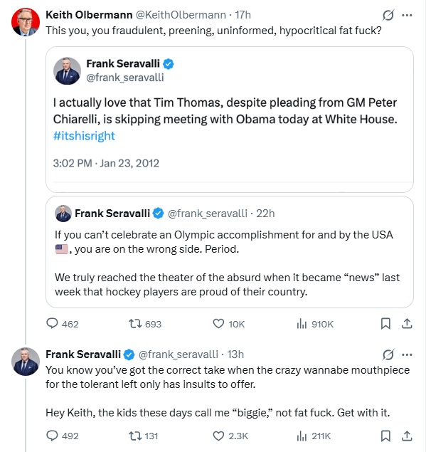 I was kind of hoping that Seravalli would hit Olbermann with the bleach tweet. Remember that one? This was one of the most savage replies that social media has ever seen: