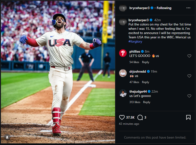 Harper wore the red, white, and blue for America for the first time when he was 15, as he said in his Instagram post. He later played for the U-18 Team USA back in 2008, before he was drafted by the Nationals. Harper was committed to join Kyle Schwarber, J.T. Realmuto, and Trea Turner on the World Baseball Classic team back in 2023, but was unable to play due to Tommy John surgery recovery.