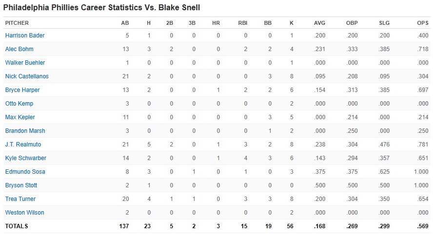 Only Alec Bohm, Edmundo Sosa, J.T. Realmuto, and Bryson Stott are hitting better than .225 career against Snell, through the Stott and Sosa data is negligible. They’ve only face Snell 10 times total, and eight of those at-bats belong to Sosa. The slight bit of silver lining here is the eight walks drawn by the Phillies top three of Trea Turner, Kyle Schwarber, and Bryce Harper, which went 1 for 11 in Game 1.