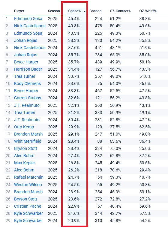 On the other side of the spectrum. Bryson Stott continues to excel in this area. Not only does he chase at some of the lowest individual rates, but when he does chase, he makes contact at 74% on average over these past two years. Kyle Schwarber is also very disciplined here, with a caveat. He has the lowest chase rates on the team, below 22% both seasons, but when he does swing, he rarely makes contact, whiffing above 54% on average.