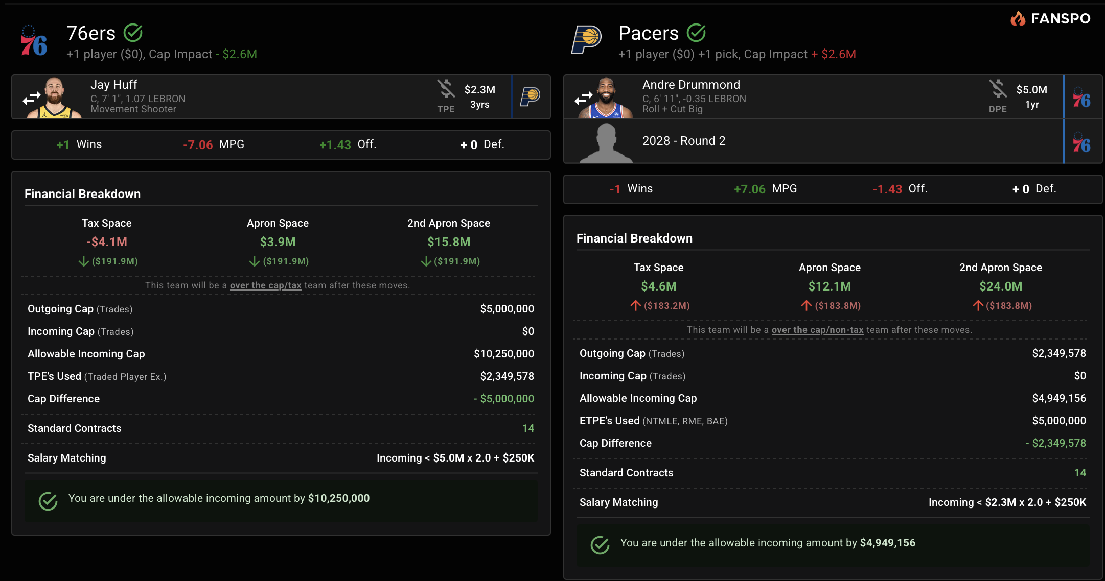 Jay Huff is a personal favorite trade target of mine, averaging 8.3 points, 3.7 rebounds, and 2.0 blocks per game across his 19.2 minutes on the 11-36 Indiana Pacers. Flipping Drummond and a draft pick for Huff would be an upgrade in the position for a player $2.7 million cheaper. This is not to say the Pacers would be interested, depending on how they view Huff and his two remaining contract years after this season. But the point is, it can be done.