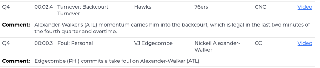 Flash forward to the next day, when the NBA drops the last two-minute reports for each matchup. The goal of this is allegedly transparency and accountability. The L2M report of the Sixers vs. Hawks game confirmed that this was correctly not called backcourt because “Alexander-Walker’s (ATL) momentum carries him into the backcourt, which is legal in the last two minutes of the fourth quarter and overtime.” –