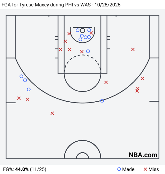 The Sixers defeated the Wizards in overtime on Tuesday night to improve to 4-0 on the season. They had to dig deep for this one after deciding that defense was optional on the second night of a home/road back-to-back, but they got the job done with 39 points and 10 assists from Tyrese Maxey and an efficient 25/7/5 in 23 Joel Embiid minutes. Quentin Grimes pitched in 23 off the bench as the Sixers once again shot better than 40% from three.