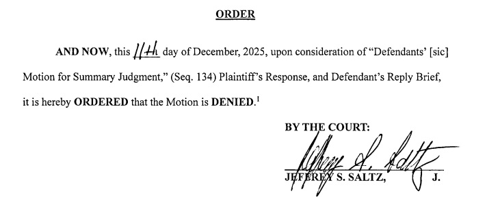 At this point, the judge has denied multiple requests for judgment and the case remains open. It could go to trial, since the deposition process is complete and no ruling has been handed down.