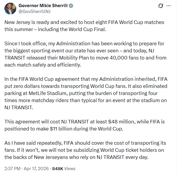New Jersey has been butting heads with FIFA over who is supposed to pay for transit increases. Parking has been mostly eliminated at MetLife, requiring a larger volume of fans who need mass transit, and still-relatively-new governor Mikie Sherrill wrote on Friday that her administration inherited an agreement that she’s not on board with: