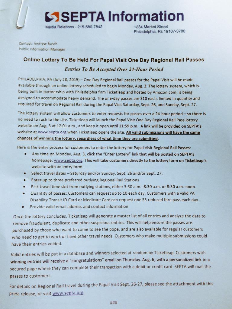 SEPTA, who previously had some serious issues selling their Pope Passes online, finally came up with a solution: an online lottery. The lottery – which sounds like a terrible last-minute make-up idea – will be run by Ticketleap and hosted by Amazon.com. The lottery will be open for 24-hours “so there is no reason to rush the site,” a release warns, from 12:01 AM on August 3rd until 11:59 PM that evening. There will be a lottery entry form on SEPTA’s website, where the entrant can pick their station of choice, timeframe, day, and enter how many passes they want (up to ten each day).