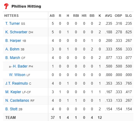 If you look at the the three games the Phillies lost, they scored three runs, three runs, and one run, so 2.3 runs per game, which isn’t gonna get it done. But we’ve seen this movie before, three times in three seasons actually, so nobody is truly surprised, and that’s the sad part.